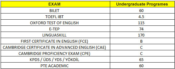 In accordance with Article 6, Paragraph 3, Sub-Paragraphs d and m of the Center for Student Selection and Placement (ÖSYM) Foreign Language Equivalence Recognition Directive, the following criteria must be present for any exam shown in the table above to be considered equivalent to the BİLET exam: