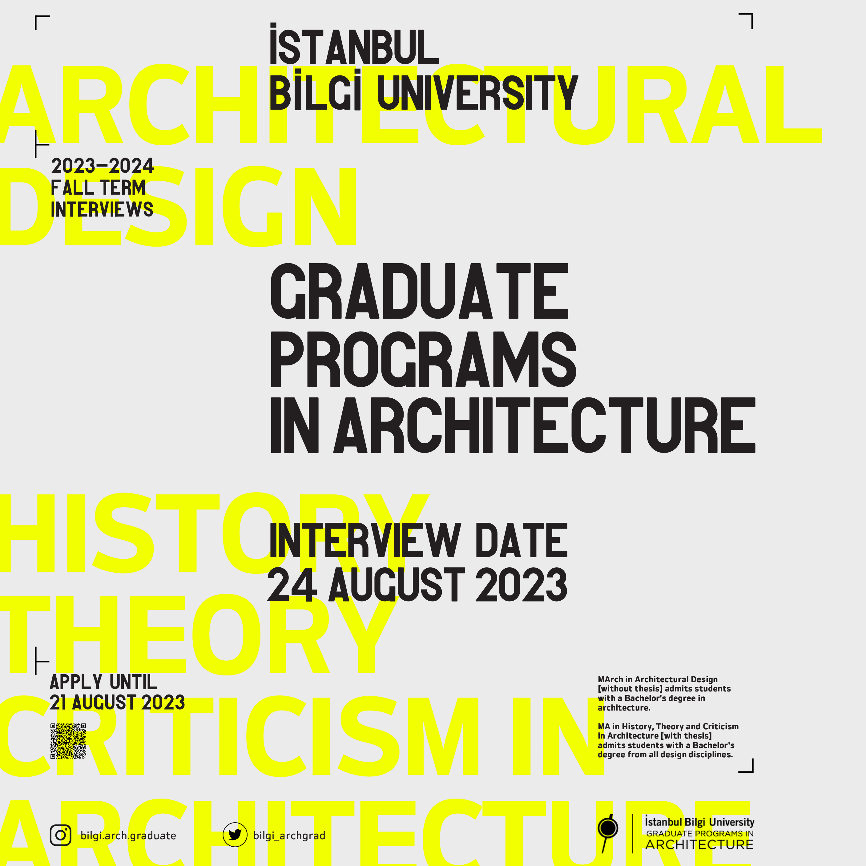The applications for BİLGİ Graduate Programs in Architecture are ongoing. The final interview date for 23-24 Fall Term Registration is 24.08.2023. The application deadline for this interview is 21.08.2023.