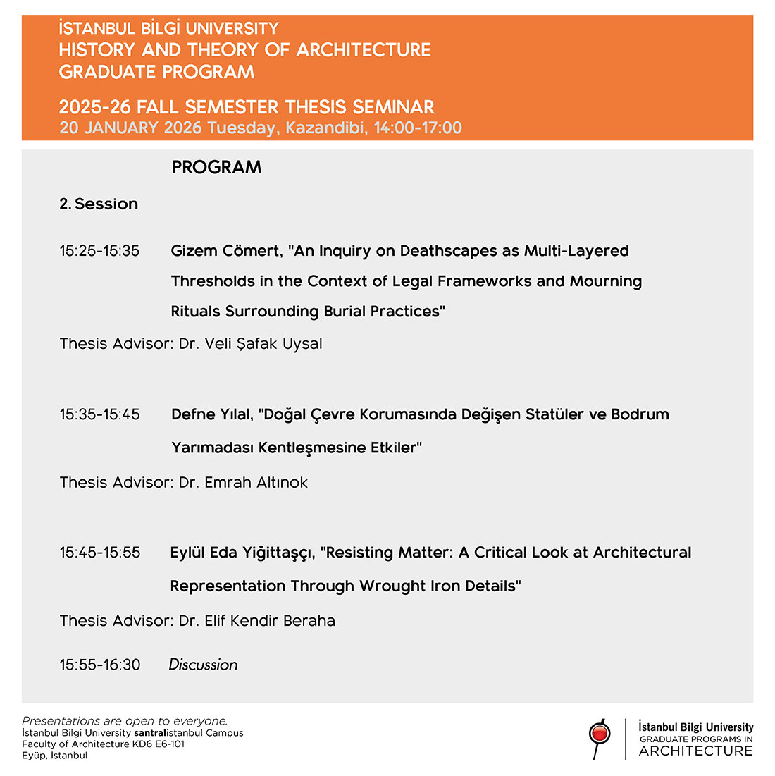 Due to weather conditions, the event has been postponed to Tuesday, January 20, 2026, between 14:00-17:00. All interested faculty members and students are invited. History and Theory of Architecture 25-26 Fall Semester Thesis Seminar History and Theory of Architecture Master's Program’s eighth Thesis Seminar, where our students will present their studies, will be held in Kazandibi on Tuesday, January 20, 2026, between 14:00-17:00. The aim of the seminar is to learn about the research our students are working on in their thesis studies, to be informed about one another, and to create a sharing environment. The presentations will be open to everyone. You can review our poster for the detailed program of the presentation.