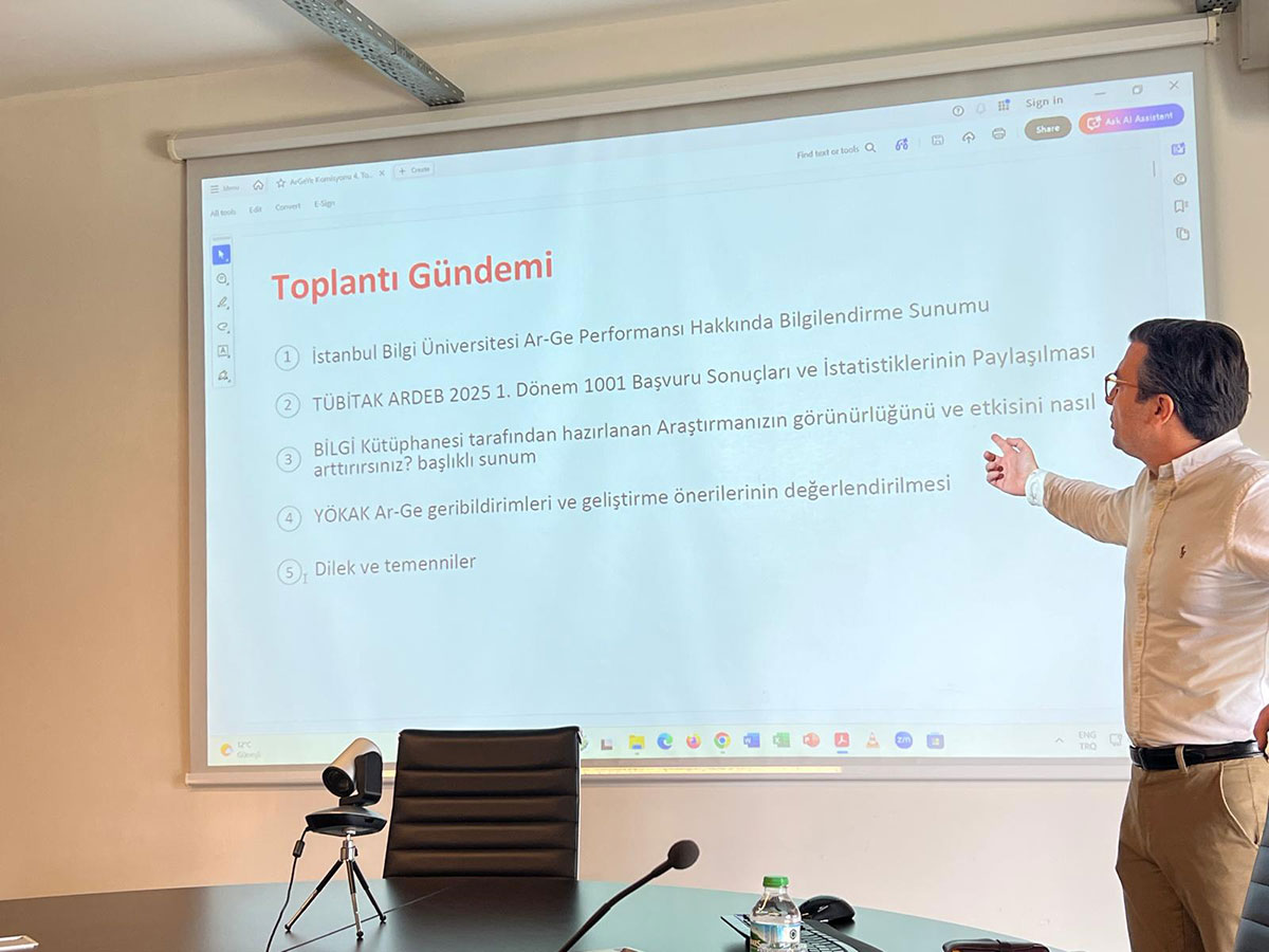 During the meeting, the university’s R&D performance, project applications, and support mechanisms were reviewed based on the most recent data, and the results of the TÜBİTAK ARDEB 2025/1 1001 program were analyzed. A presentation was delivered by the BİLGİ Library on enhancing research visibility and citation impact. The current structure of the entrepreneurship ecosystem and related support mechanisms were also discussed.