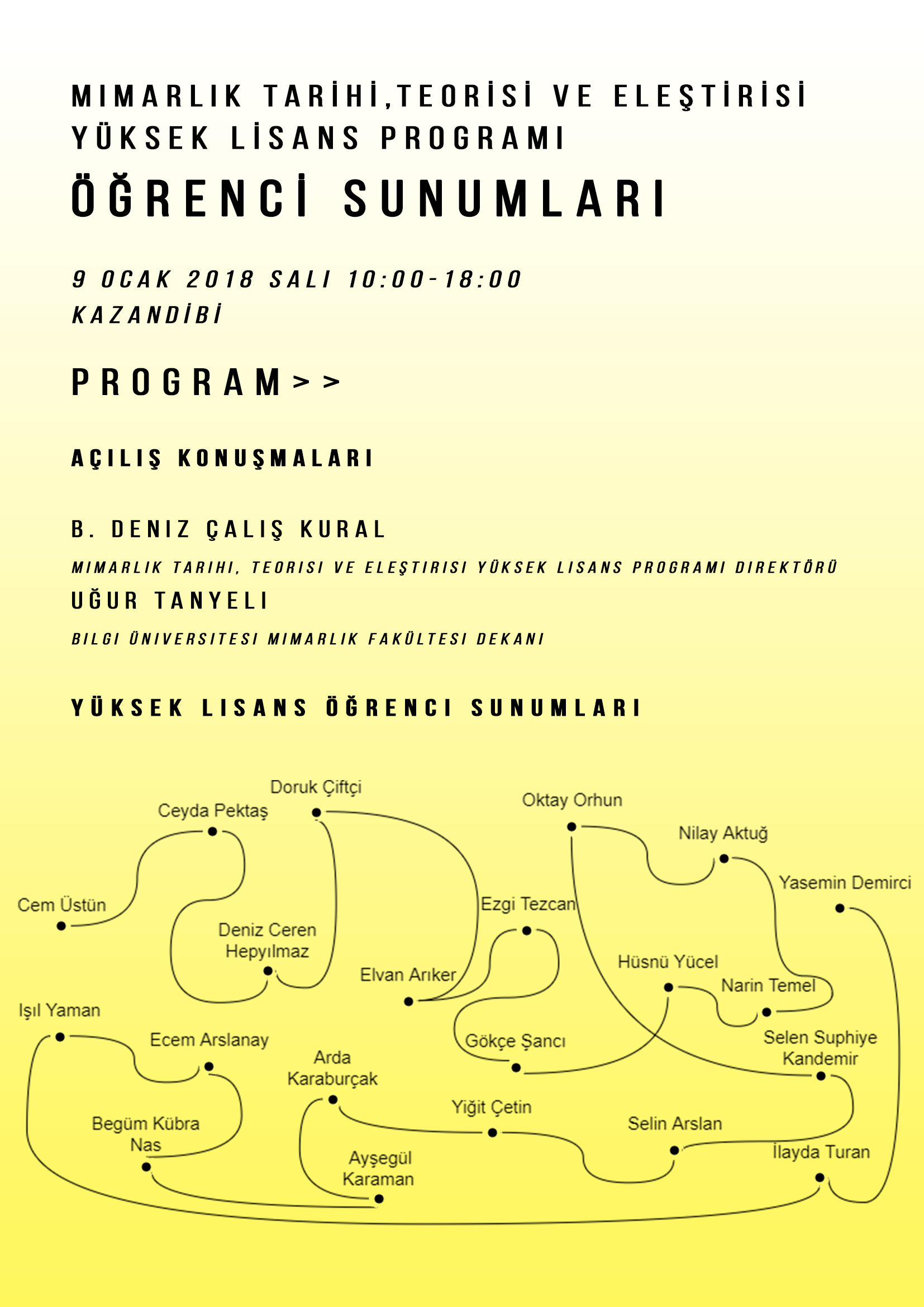 İstanbul Bilgi Üniversitesi Mimarlık Tarihi, Teorisi ve Eleştirisi Tezli Yüksek Lisans Programı’na devam eden öğrencilerimizin farklı aşamalardaki tez araştırmalarını sunacakları toplantımıza hepinizi bekliyoruz.