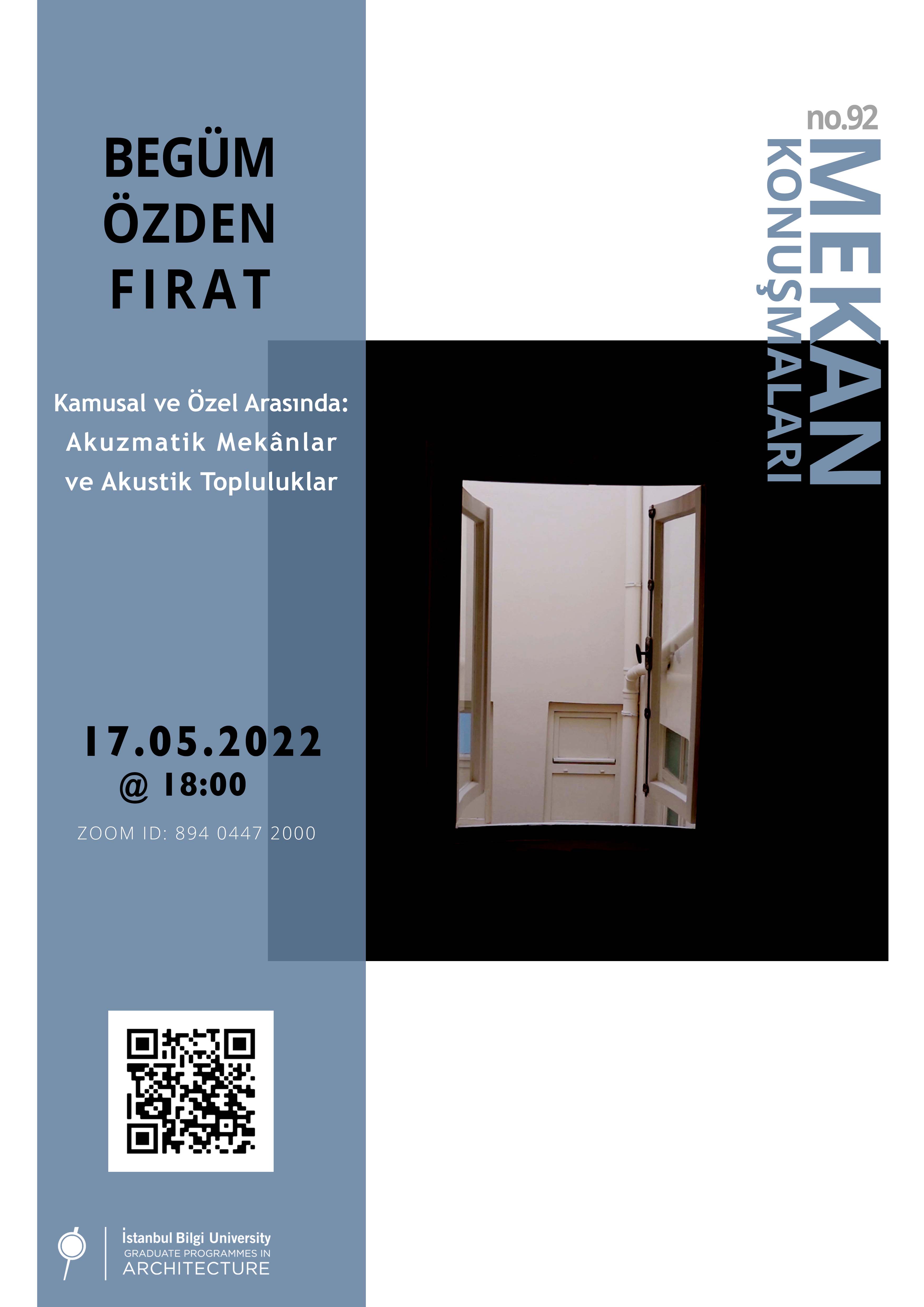 İstanbul Bilgi Üniversitesi, Mimarlık Yüksek Lisans Programları öğrencilerinin düzenlediği Mekan Konuşmaları serisinin 92.sinde "Kamusal ve Özel arasında: Akuzmatik Mekânlar ve Akustik Topluluklar" başlıklı konuşması ile Begüm Özden Fırat konuğumuz olacak. Begüm Özden Fırat, Mimar Sinan Güzel Sanatlar Üniversitesi Sosyoloji Bölümü öğretim üyesidir. Kent ve kültür sosyolojisi, görsel kültür çalışmaları ve toplumsal hareketler alanlarında çalışmaktadır. Commitment and Complicity in Cultural Theory and Practice (Palgrave/Macmillan, 2009), Cultural Activism: Practices, Dilemmas, Possibilities(Rodopi, 2011) ve Küresel Ayaklanmalar Çağında Direniş ve Estetik (İletişim, 2015) kitaplarının editörlerindendir.