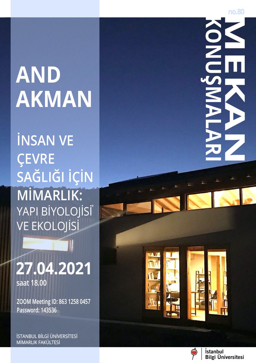 İstanbul Bilgi Üniversitesi Mimarlık Yüksek Lisans Programları öğrencilerinin düzenlediği “Mekân Konuşmaları” dizisinin 80.sinde Türkiye Yapı Biyolojisi ve Ekolojisi Enstitüsü kurucularından And Akman bizlerle olacak. Bu alanda profesyonel ve akademik çalışmalarıyla on yıllardır ülkemizde öncü bir faaliyet gösteren Akman’ın konuşma başlığı “İnsan ve Çevre Sağlığı için Mimarlık: Yapı Biyolojisi ve Ekolojisi”.