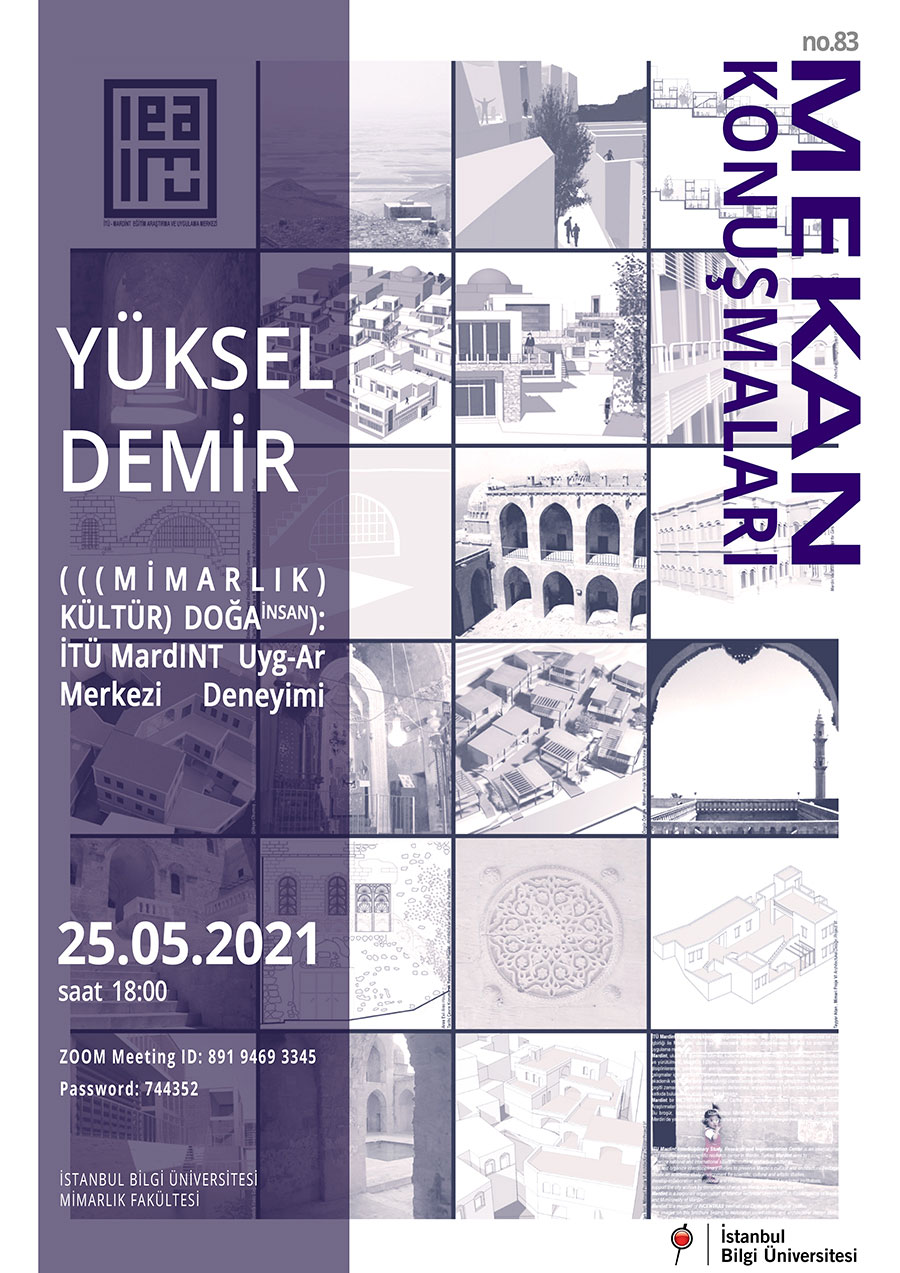 (((Mimarlık)Kültür)Doğaİnsan) İTÜ MardINT Uyg-Ar Merkezi Deneyimi başlıklı konuşmasında Yüksel Demir, Mimarlık, Kültür, Doğa ve onun üstel kuvveti İnsan arasındaki ilişkiye İTÜ Mardin Uyg-Ar Merkezi (MardINT) ile Mardin’den başlayarak İTÜ Kutup Ug-Ar Merkezi bünyesinde Antarktika’da devam eden deneyim çerçevesinde bir konuşma yapacak.