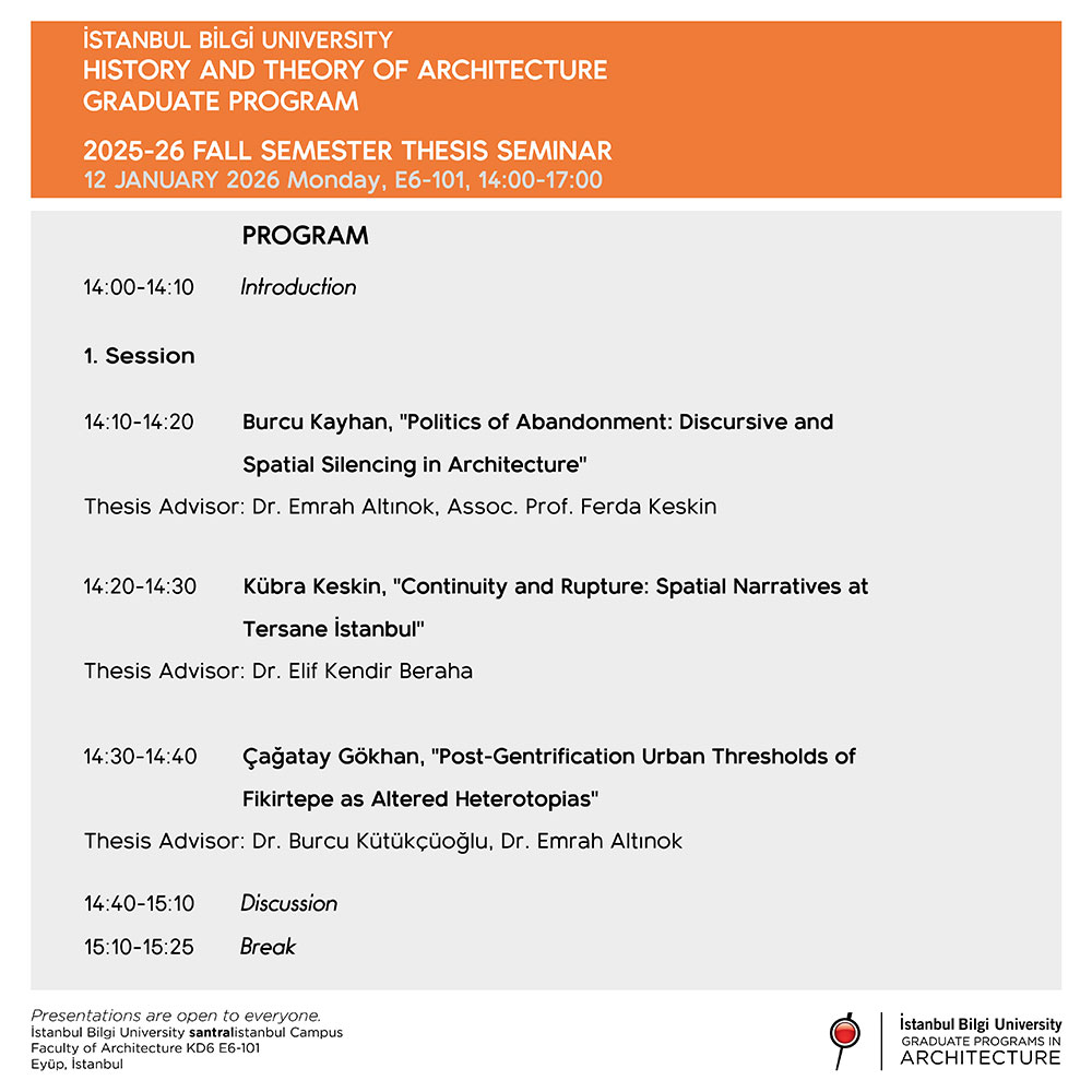 Mimarlık Tarihi ve Kuramı Yüksek Lisans Programı öğrencilerimizin çalışmalarını sunacakları Yüksek Lisans Tez Çalışmaları Semineri’nin sekizincisi 12 Ocak 2026 Pazartesi günü 14.00-17.00 arasında E6-101’de gerçekleşecek.
