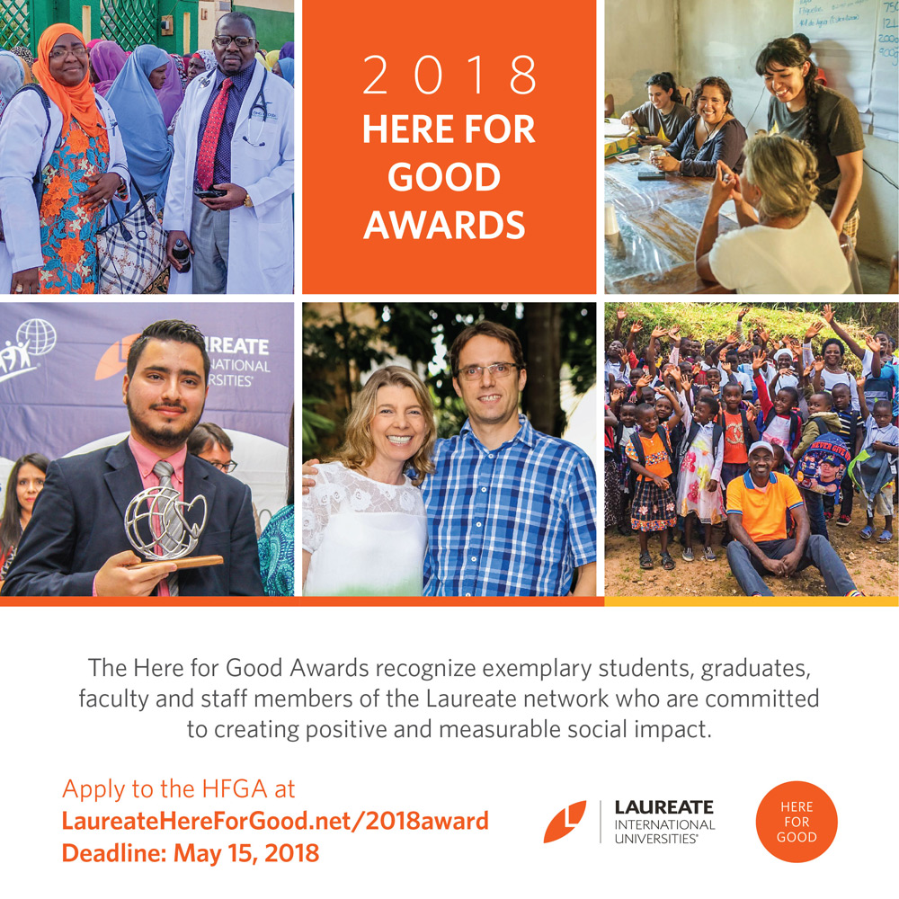 “Here for Good” ödülleri, Laureate ağında yer alan ve önemli sosyal değişim yaratan insanların hikâyelerini duyurmak için her yıl veriliyor. Bu yıl “Recognizing, Connecting, and Encouraging a Network of Social Good” konusuyla bulundukları topluma pozitif etkide bulunan Laureate öğrencileri, mezunları, akademisyenleri ve çalışanları, üniversite deneyimlerini sosyal fayda sağlamak için kullanıyor.